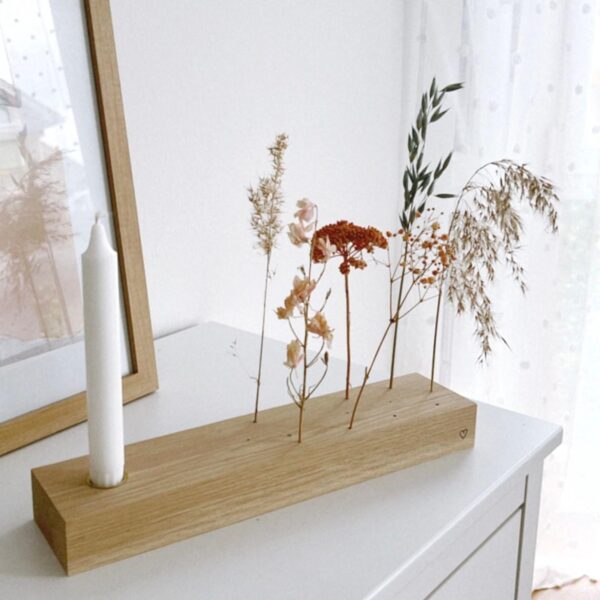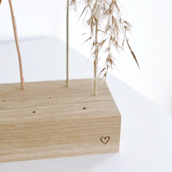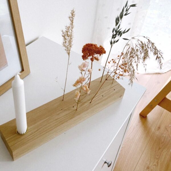 Cette plaque en bois de chêne, munies de petits trous pour accueillir des fleurs séchées ou des fleurs des champs, se mariera à merveille dans votre intérieur pour lui apporter un effet nature.