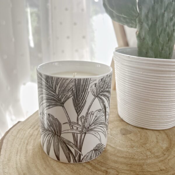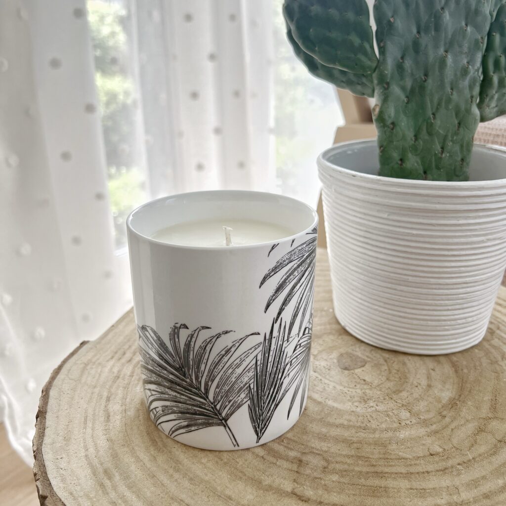 Bougie à la douce odeur de fleur des îles dans un pot en porcelaine avec des feuilles de palmier.