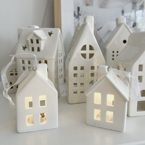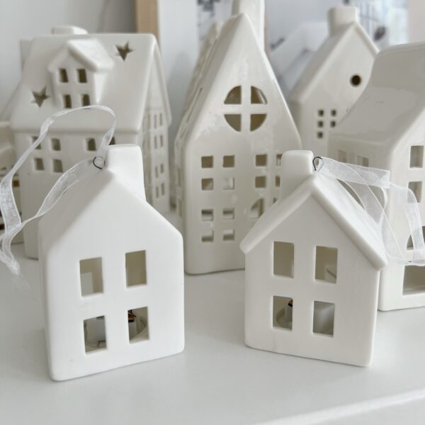 Lot de 2 petites maisons en céramique à suspendre au sapin de Noël ou ailleurs. L’une avec un avant-toit et l’autre sans.